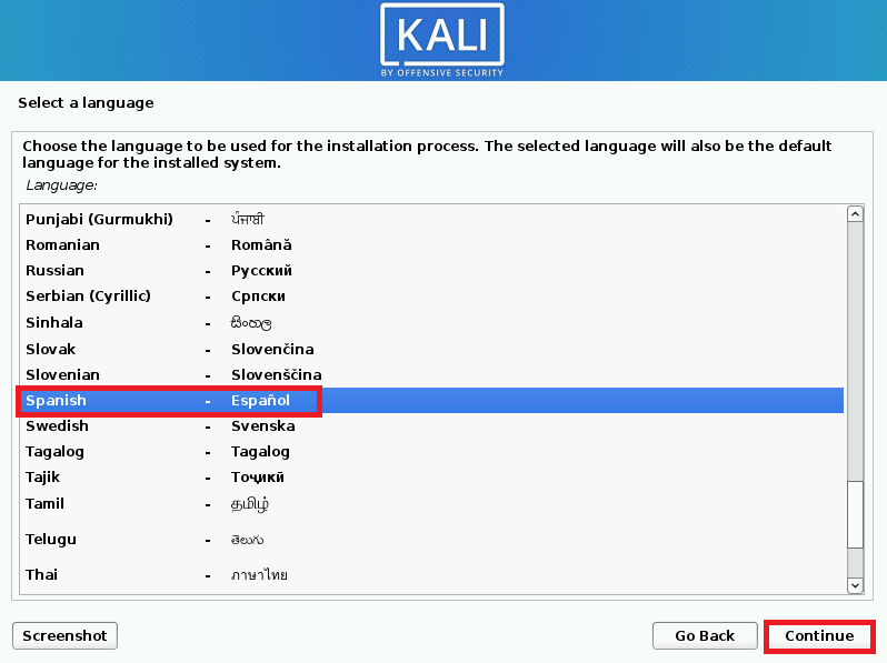 Dará comienzo el proceso de instalación del entorno de pentesting Kali Linux. El primer paso por realizar es seleccionar el idioma con el que se desea continuar la instalación.